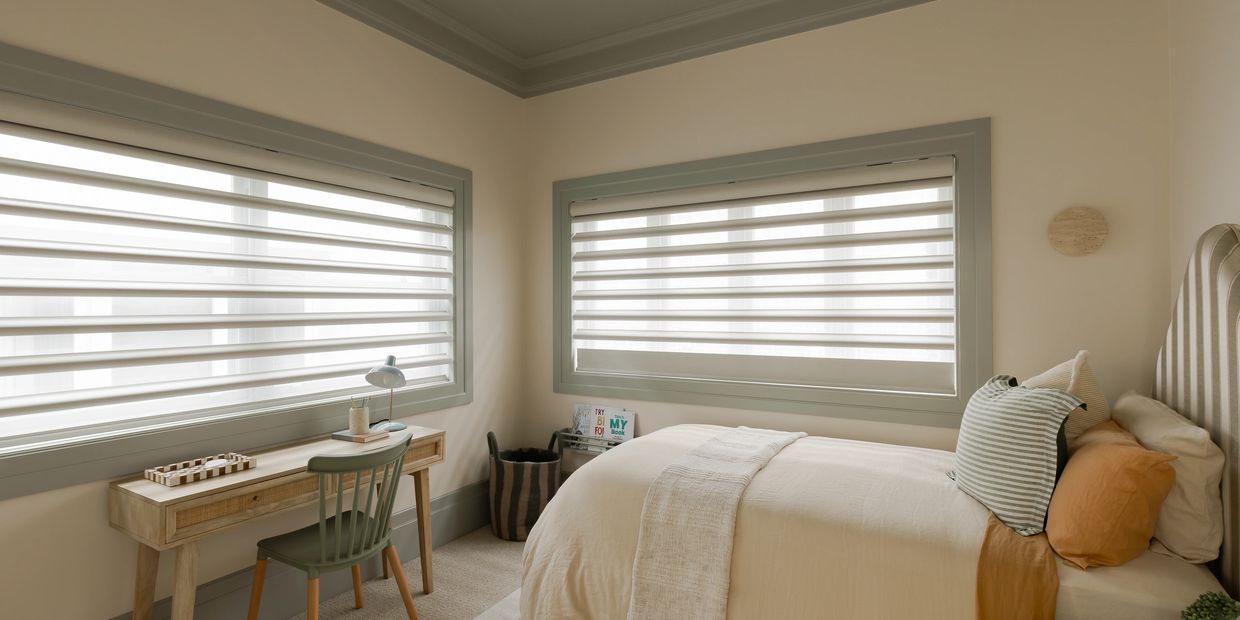 Transform your living space with Luxaflex Pirouette Shadings—a patented, three-dimensional window fashion that combines innovative design with timeless elegance. Featuring soft, curved fabric vanes floating on a sheer fabric backing, this stylish solution allows you to precisely control light and privacy. Effortlessly draw natural light into the room, filter views with gentle softness, or create complete privacy—all while enjoying UV protection and a full spectrum of light-filtering possibilities, with Luxaflex Pirouette shades.